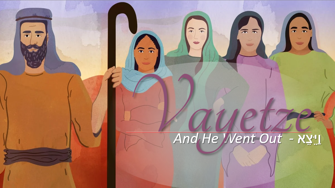 The seventh reading from the book of Genesis is named Vayetze, which means "and he went out." The title comes from the first verse of the reading, which says, "And Jacob went out from Beersheba" (Genesis 28:10 KJV). This portion tells the story of Jacob's flight from his brother Esau, his vision at Bethel, his employment with his uncle Laban, and his marriage to the two sisters Rachel and Leah. Jacob's double marriage results in a baby-bearing contest giving him eleven sons. At the end of the portion, Jacob leaves Laban and returns to the land of Canaan but not before Laban tries to stop him.