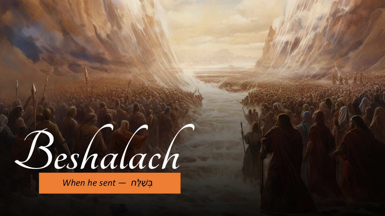 The sixteenth reading from the Torah is named Beshalach, which means "when he sent." The title comes from the first verse of the reading, which can be literally translated to say, "And it happened when Pharaoh sent out the people." The reading tells the adventures of the Israelites as they leave Egypt, cross the Red Sea, receive miraculous provision in the wilderness, and face their first battle.