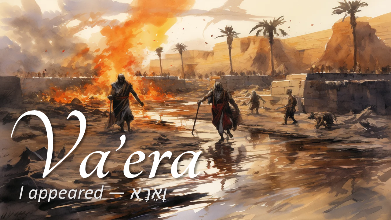 The second reading from the book of Exodus and fourteenth reading from the Torah is named Va'era, which means "And I Appeared." The title comes from the first words of the second verse of the reading, which says, "And I appeared to Abraham, Isaac, and Jacob, as God Almighty" (Exodus 6:3). The portion begins with four expressions of redemption whereby God promises to bring Israel out of the Egyptian bondage. The narrative progresses to tell the story of the first seven of the ten plagues that God unleashed on Egypt.