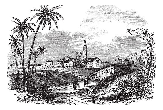 Gaza during the 1890s, vintage engraving. Old engraved illustration of Gaza with people and trees in front. Trousset encyclopedia (1886 - 1891), Shutterstock