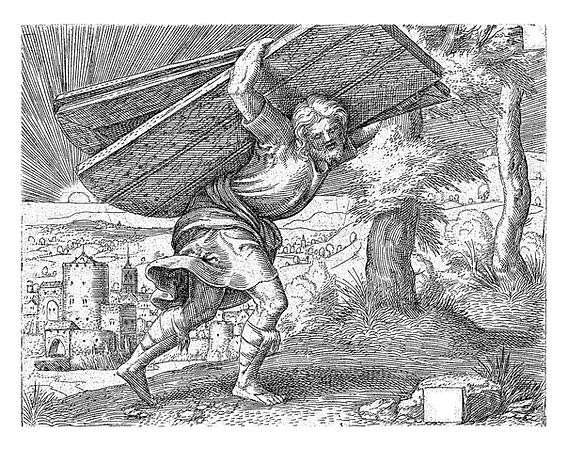 Samson carries the gates of Gaza, Cornelis Massijs, 1549 Samson carries the gates of the city of Gaza on his shoulders. In the background Gaza with the open city gate, Shutterstock