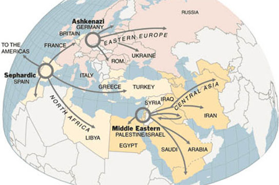 So, no definitive test can say, “I am Jewish,” but DNA correlations can be made among groups who have historically identified themselves as Jewish, such as the Ashkenazi Jews of Europe. This map shows the migration of Ashkenazi, Sephardic, and Middle Eastern Jews into the nations